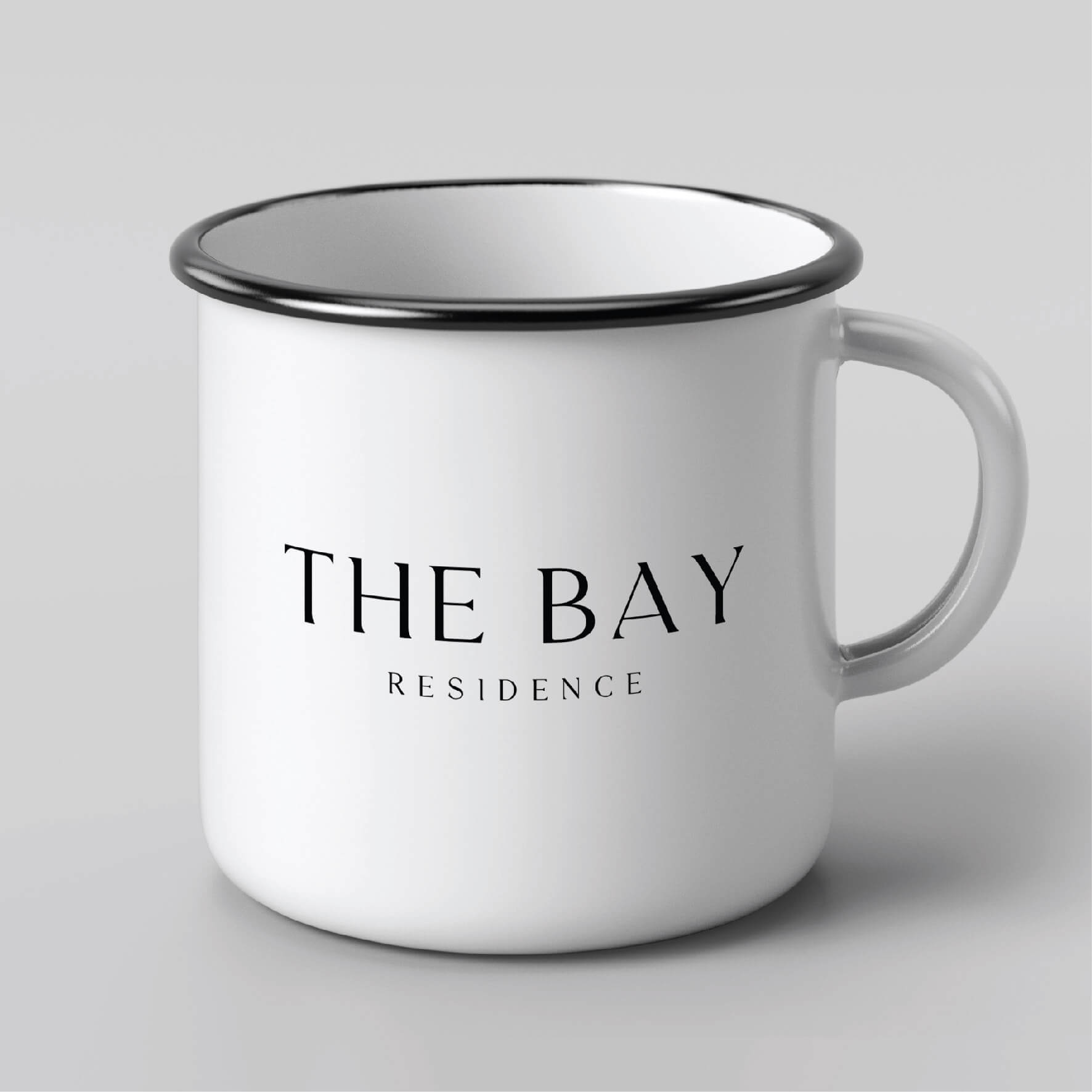 The Bay Residence logo features a typographic approach, with the word mark presented in the title case. For the English version, a slightly modified version of the serif typeface Herkings Regular is used, while the Arabic version utilizes the GE Hili Book, chosen for its compatibility with the English style. This typographic selection conveys The Bay Residence as a commercial and serious entity while maintaining a modern and forward- thinking aesthetic.